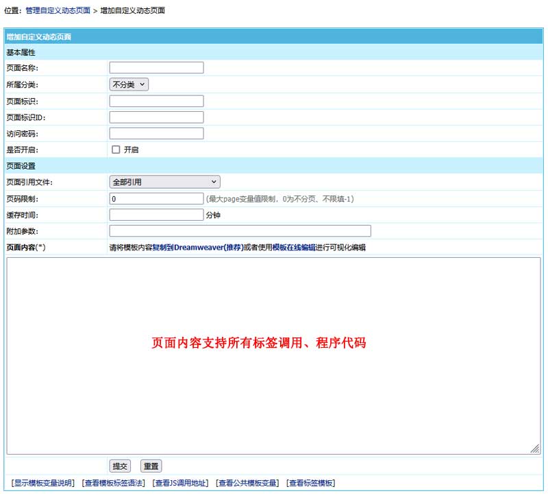 页面内容:支持所有标签调用、程序代码、模板变量。