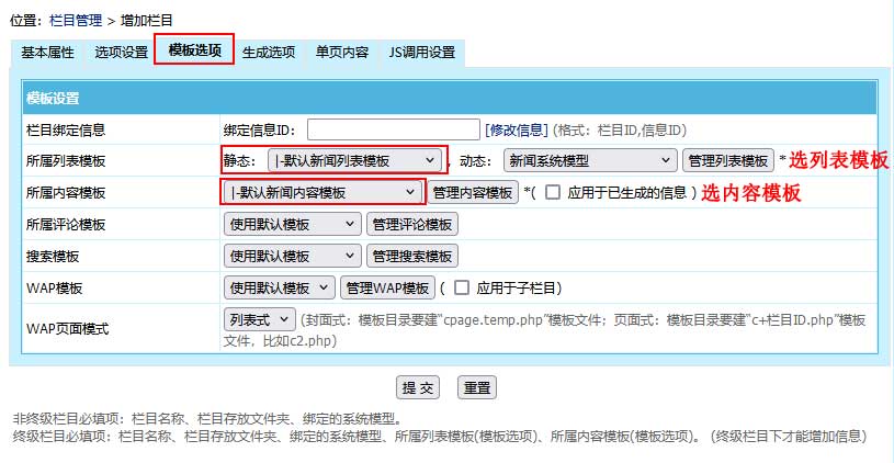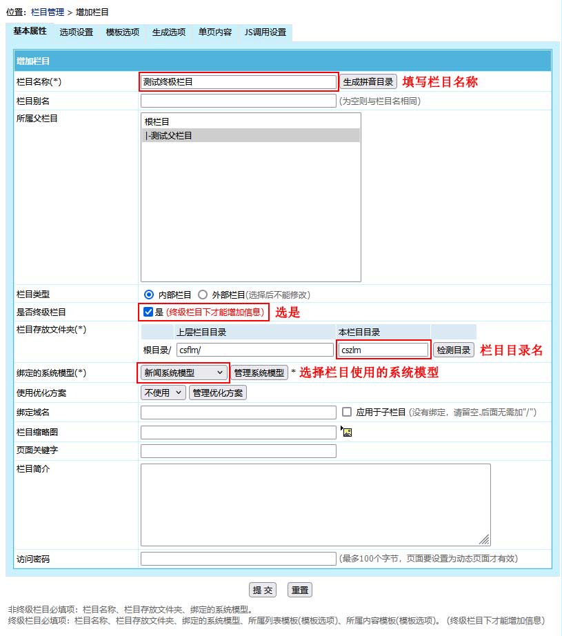 终级栏目必填项:栏目名称、栏目存放文件夹、绑定的系统模型、所属列表模板(模板选项)、所属内容模板(模板选项)。 如下图: