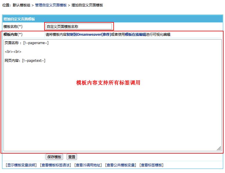 | 模板中调用 页面名称 用:[!--pagename--] 模板中调用 页面内容 用:[!--pagetext--] |