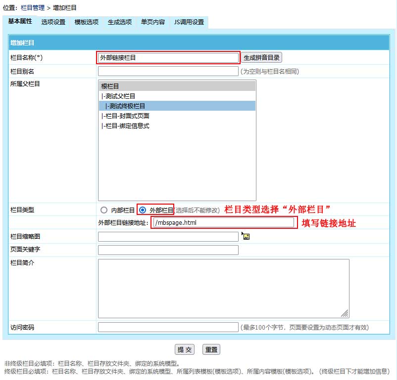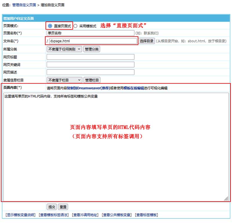 | 页面模式:选“直接页面式”。 页面名称:填写名称。 文件名:填写文件的存放路径。(目录需有读写权限) 页面内容:填写页面的html代码。 |