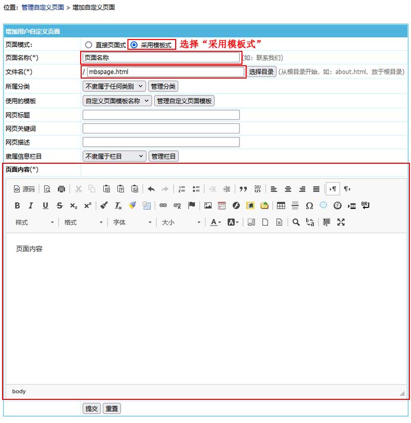 | 页面模式:选“采用模板式”。 页面名称:填写名称。 文件名:填写文件的存放路径。(目录需有读写权限) 使用的模板:选择使用的自定义页面模板。 页面内容:填写“单页内容”。 |